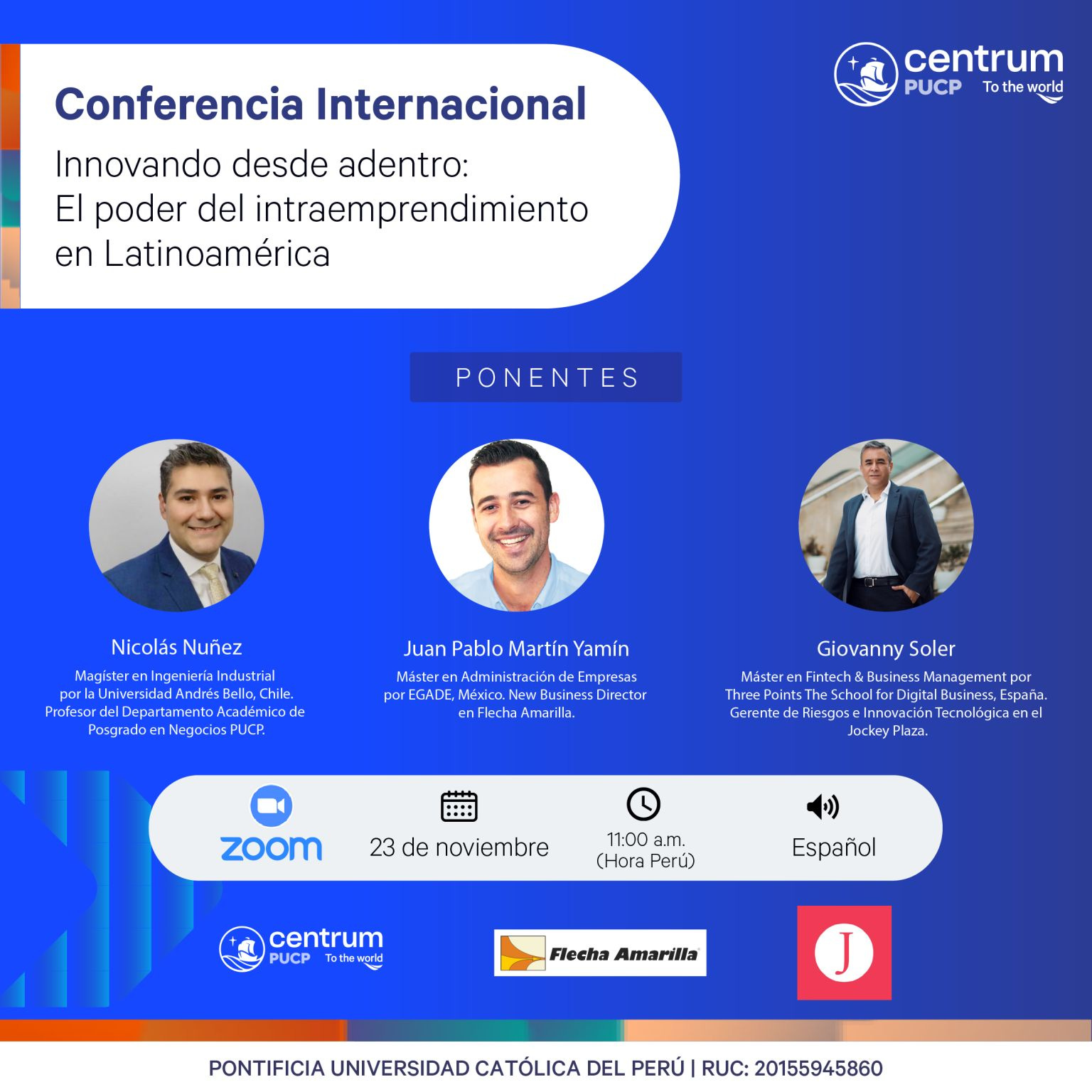 Participarde la conferencia internacional “Innovando desde adentro: El poder del intraemprendimiento en Latinoamérica”, donde exploraremos casos de éxito, estrategias efectivas y el impacto positivo que los intraemprendedores están generando en sus organizaciones.
