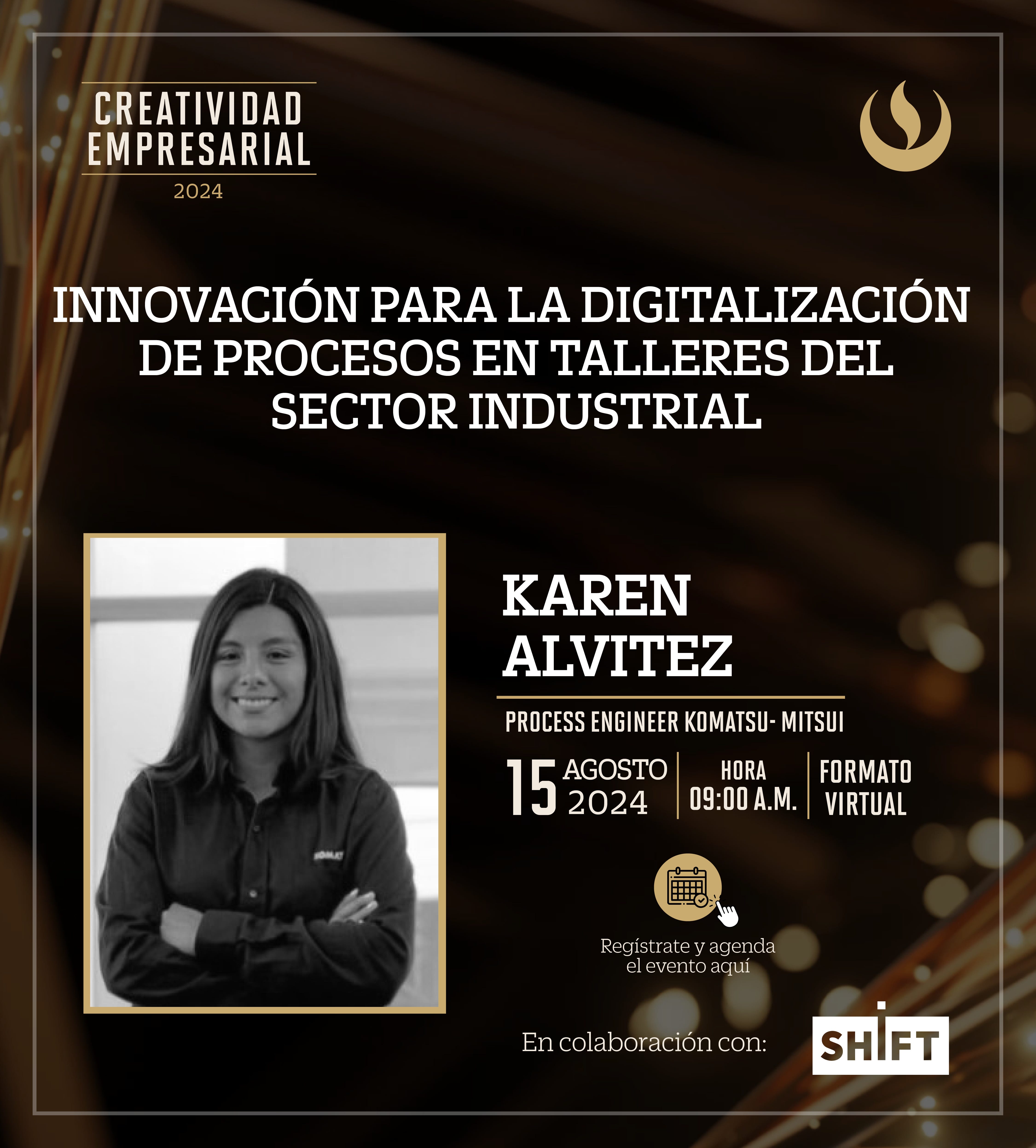 Participa la cuarta charla informativa sobre "Innovación para la digitalización de procesos en talleres del sector industrial" dirigido por Karen Alvitez Miranda, Process Engineer de Komatsu-Mitsui, quien abordará la problemática de cómo la digitalización de los procesos claves en el sector industrial impacta en las operaciones de sus áreas internas.
